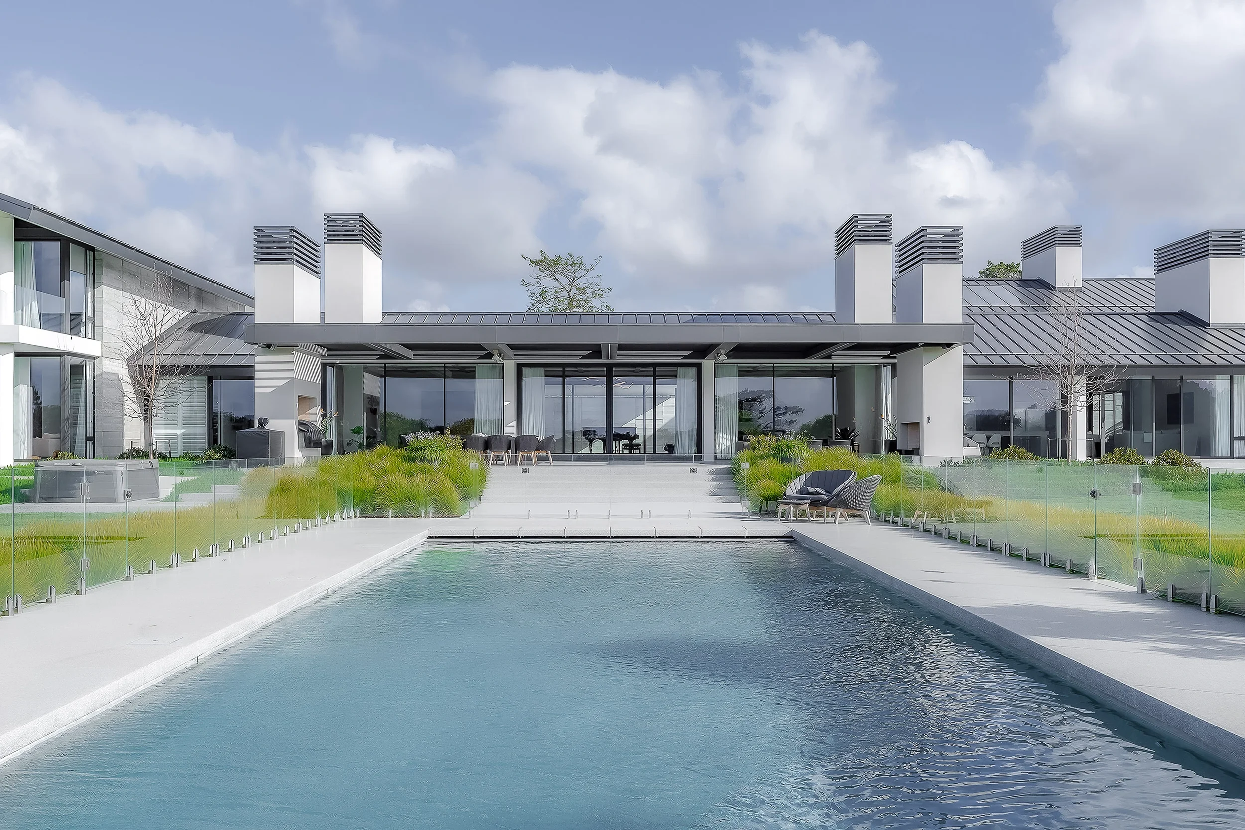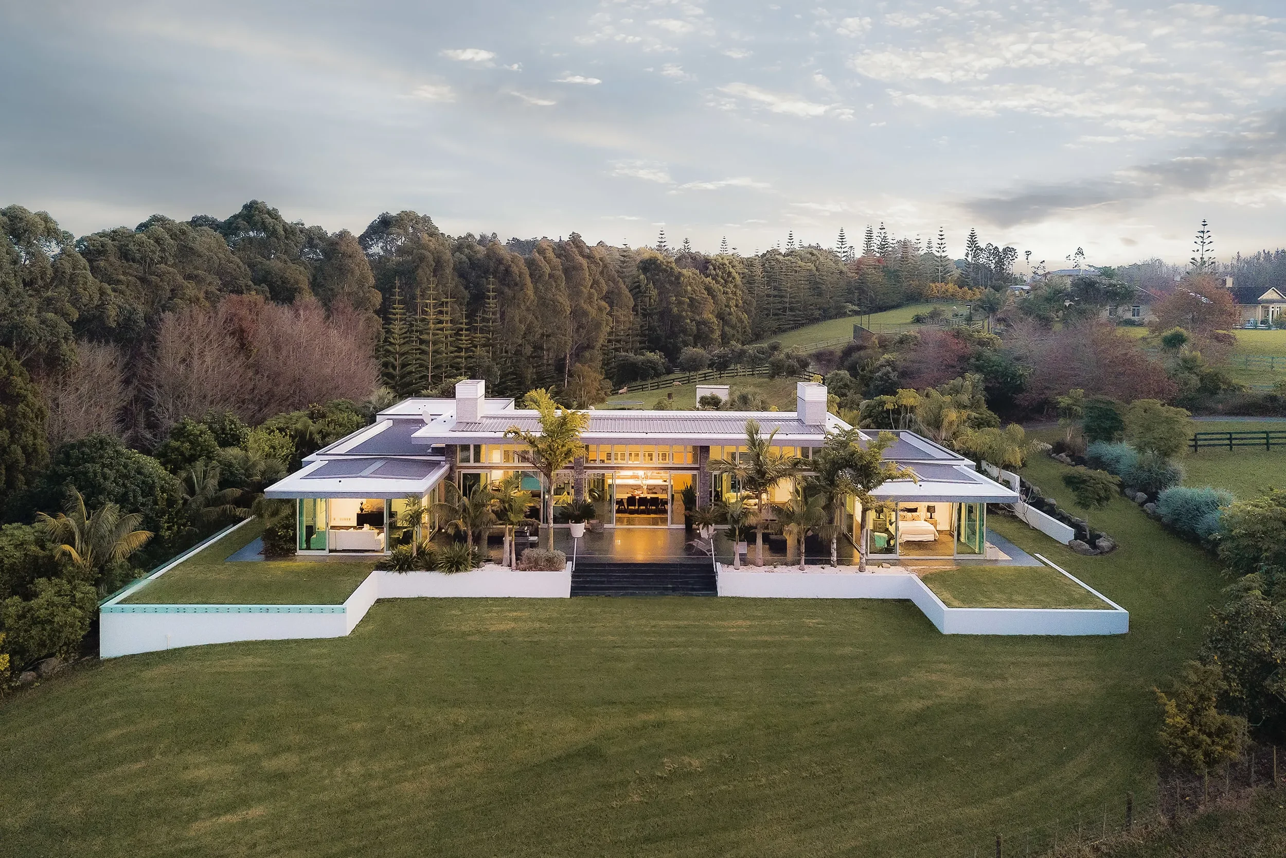 Perfectly sited, the home opens east to the ocean and west to a sheltered courtyard, with an indoor-outdoor infinity-edge pool anchoring the main living level in resort-style luxury. To achieve this striking contemporary design, two levels of the cliff were excavated. The exterior features a robust yet refined palette of split-face and sawn basalt cladding, paired with honed and flamed basalt paving that flows seamlessly between indoor and outdoor spaces. Inside, pale oak flooring adds warmth and softness, balancing the rugged stone finishes.