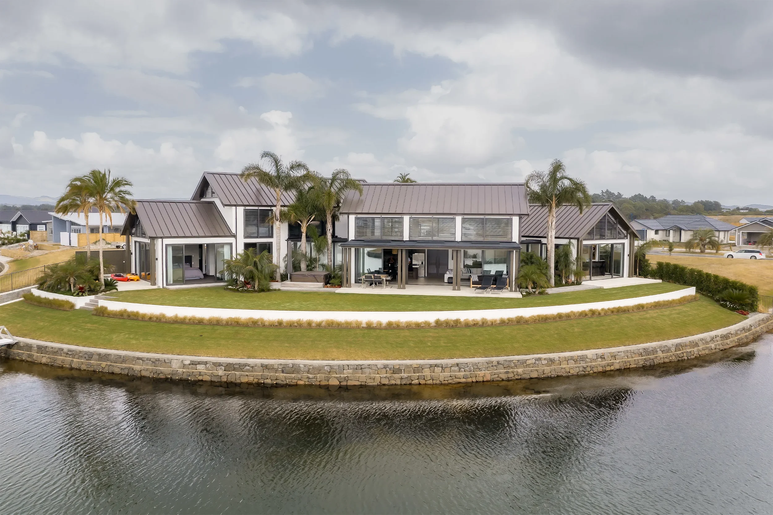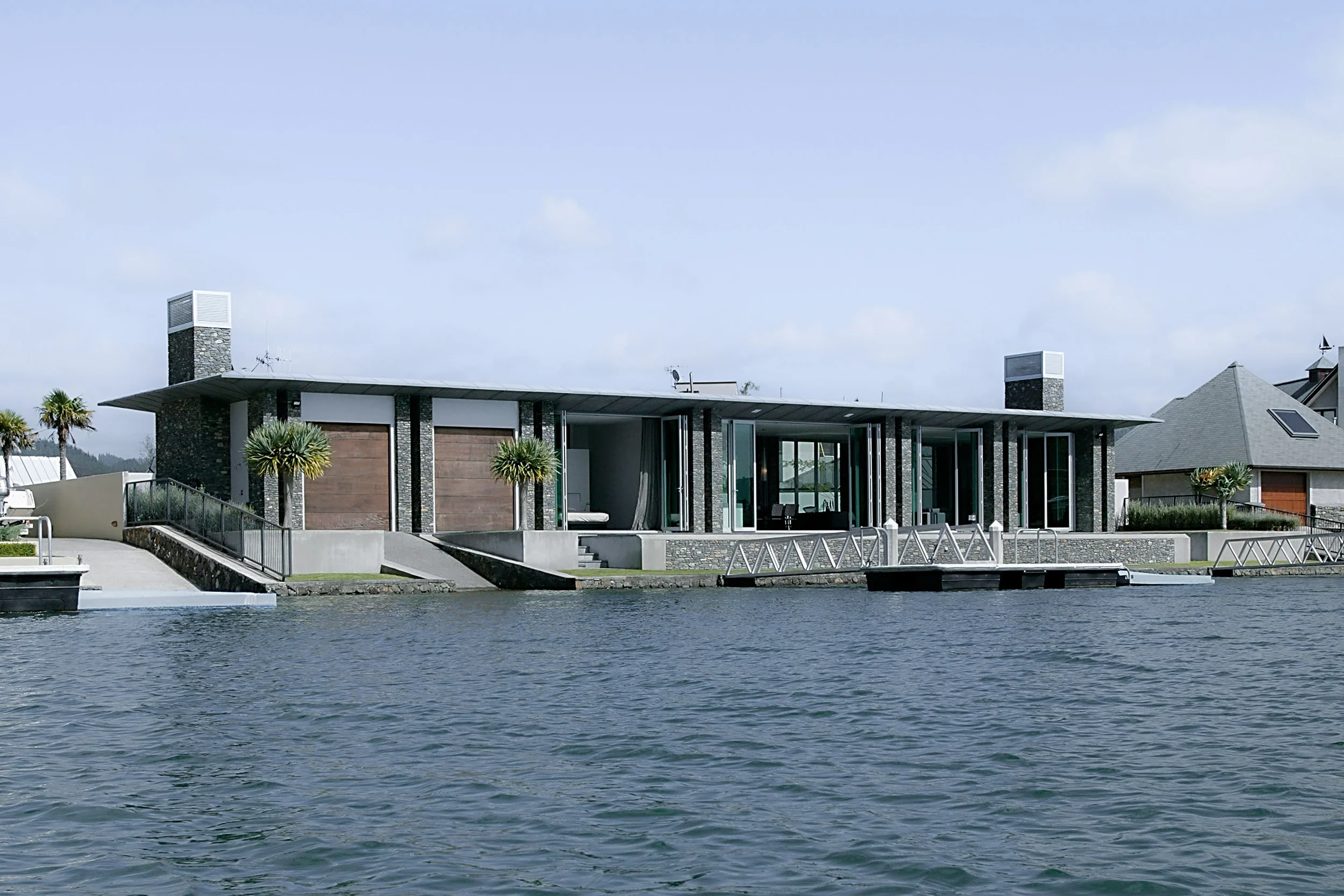 A journey through the native bush leads to a glass reading pavilion suspended over a serene stream, offering a tranquil retreat that contrasts the vibrant social hub of the barn.