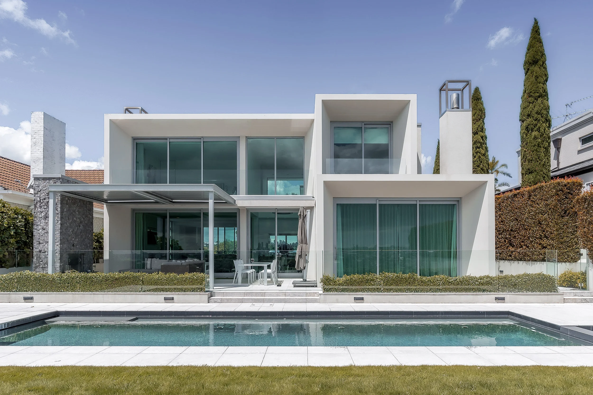 A sophisticated yet restrained material palette—including limestone floors, split basalt walls, Alucobond and zinc cladding, solid plaster and timber finishes—articulates the structure's strong geometric form. Extensive glazing allows for continuous visual connection to the landscape and harbour from both floors.