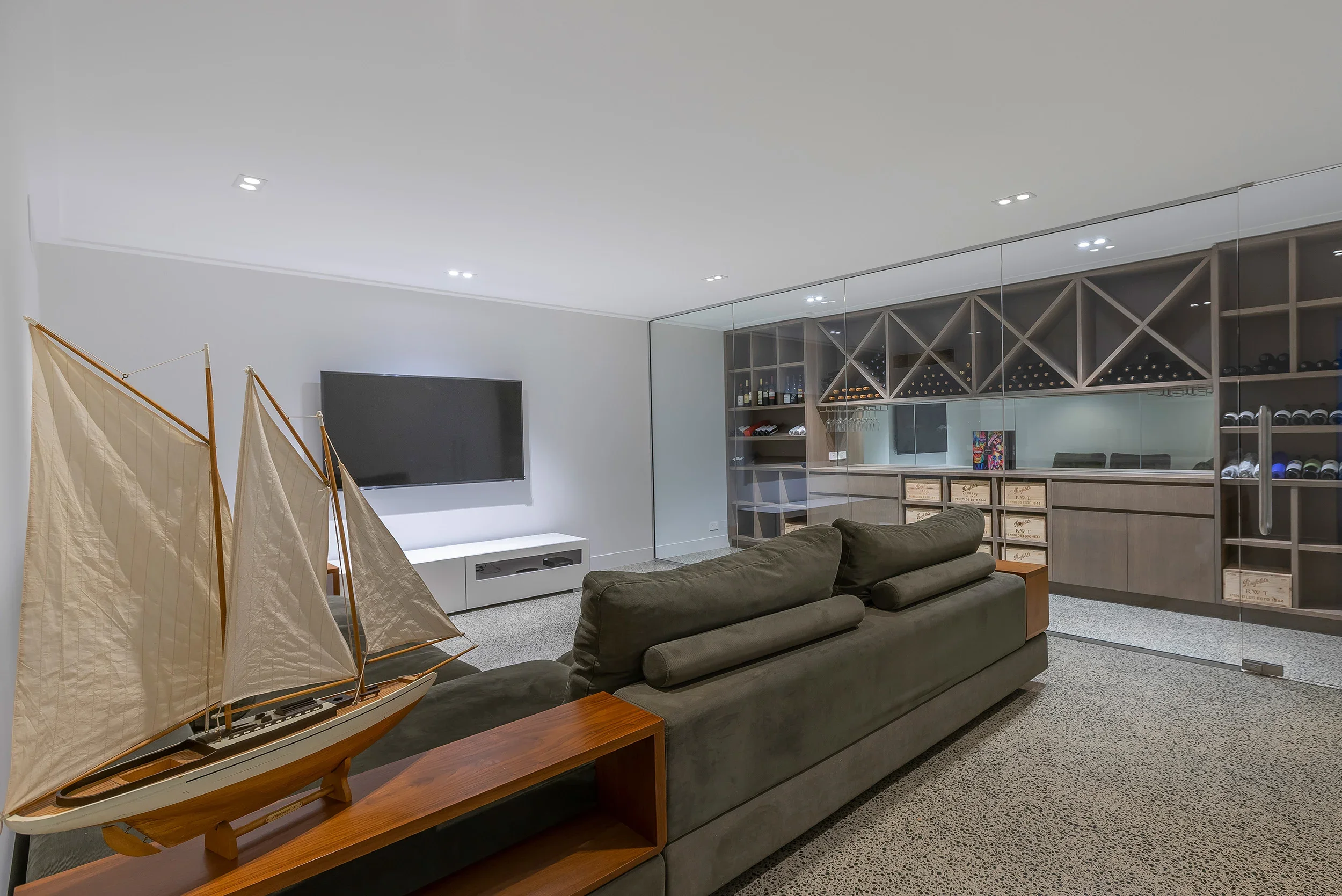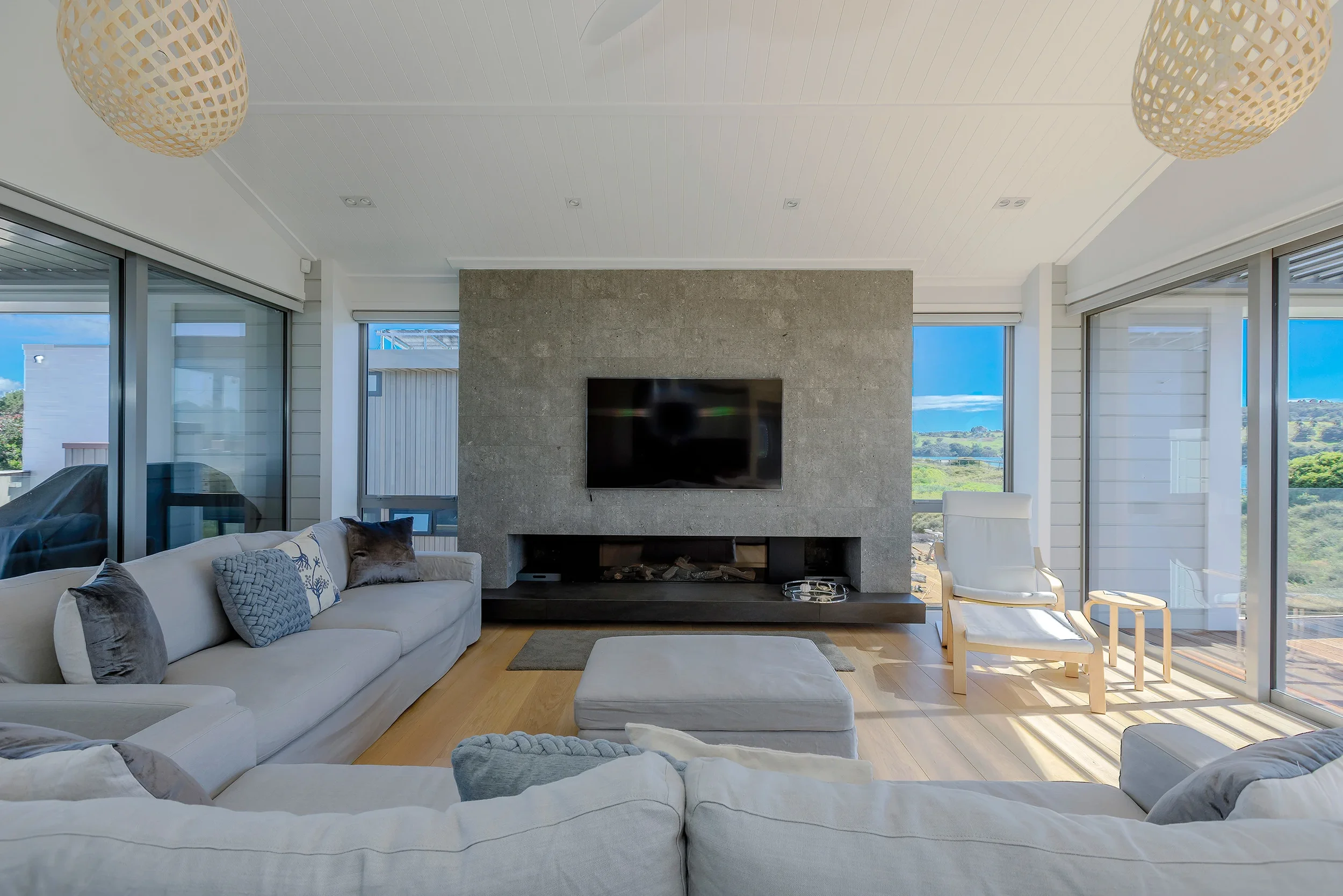 The interior combines functional design with refined aesthetics, utilising light timber flooring, pale grey finishes and stone fireplaces to create a cohesive living environment. Expansive bedroom terraces, dual living zones and a dedicated home office demonstrate a thoughtful approach to modern coastal living, balancing architectural innovation with practical family needs.