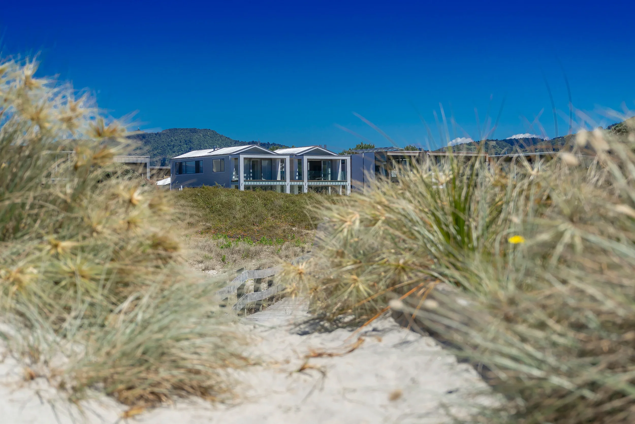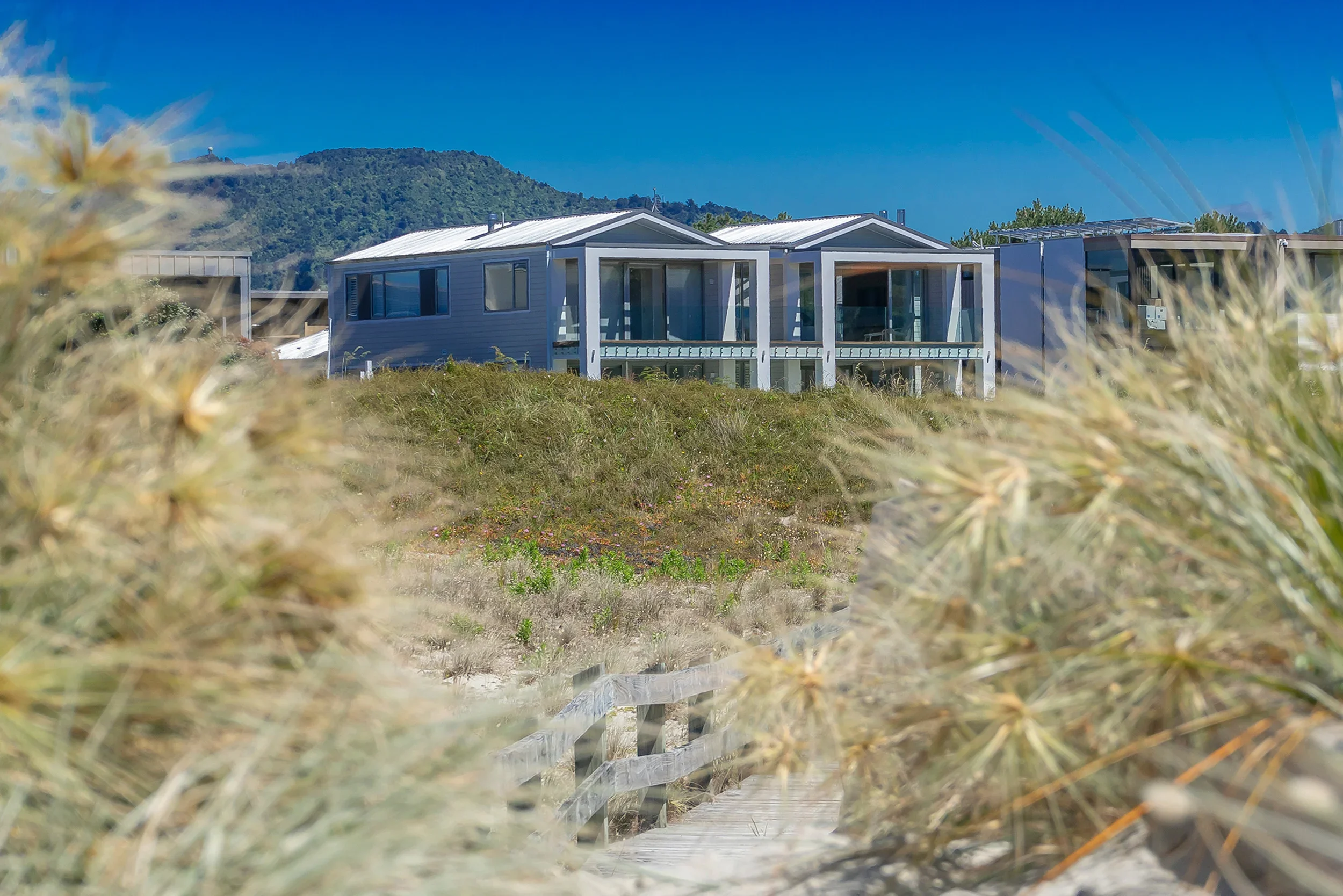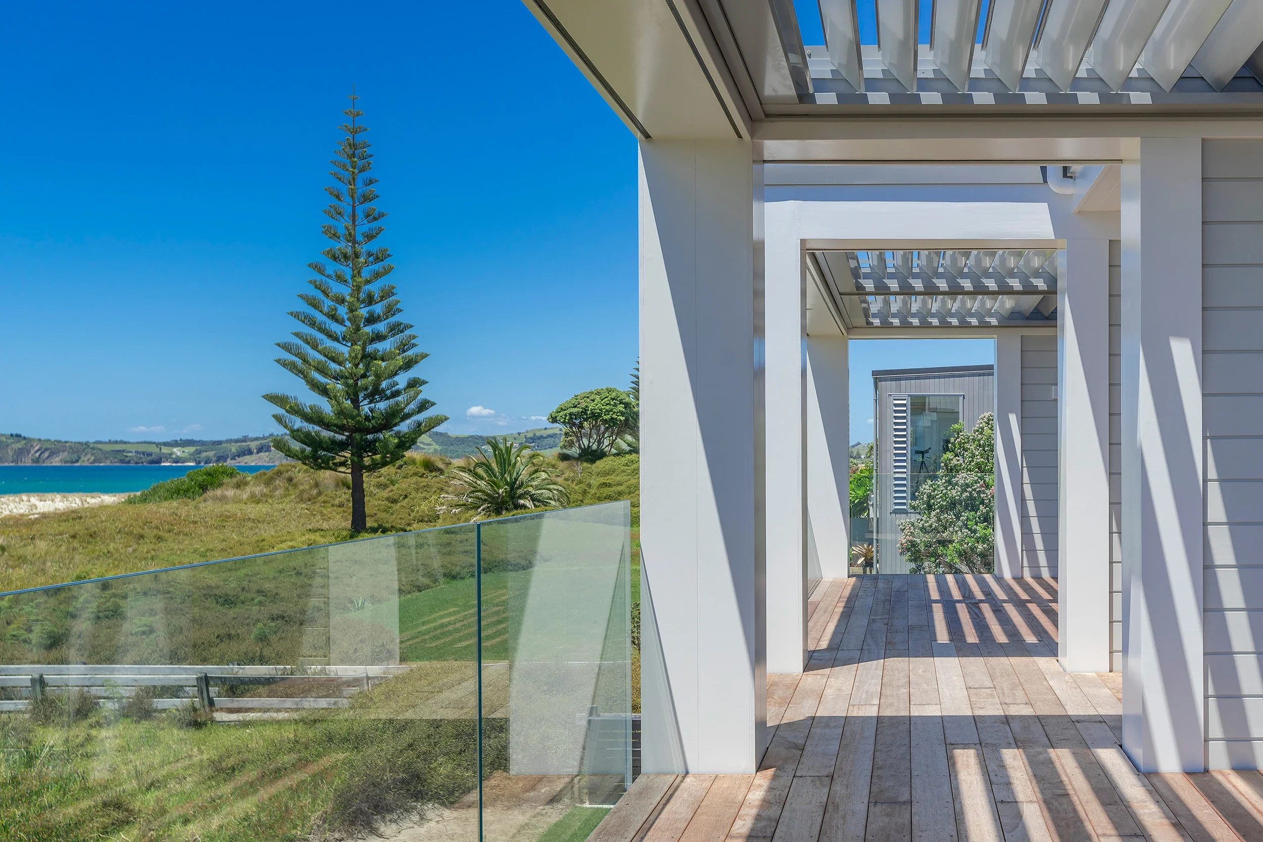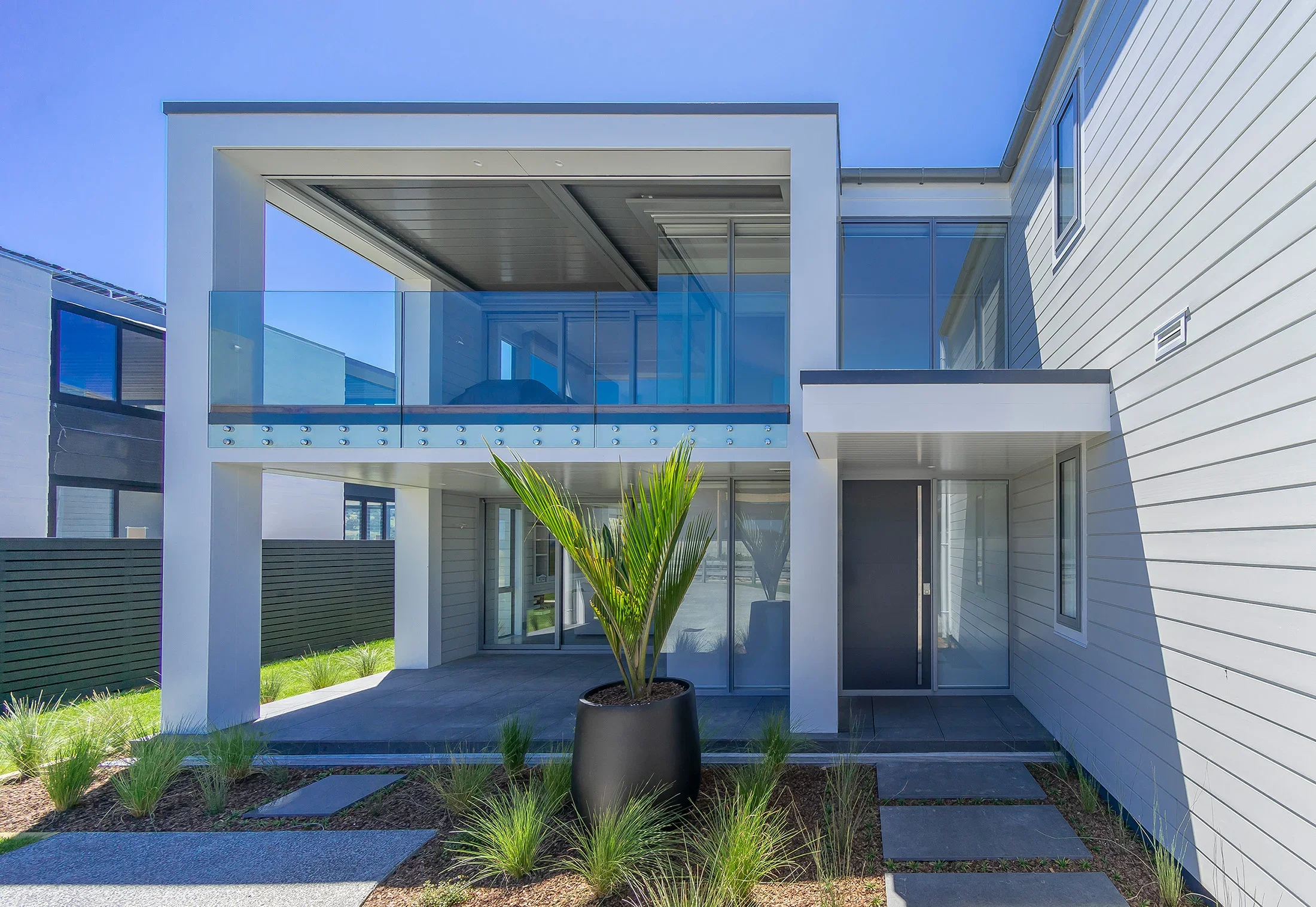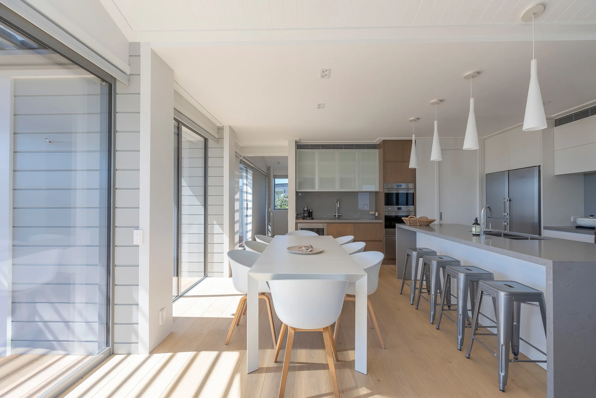 This contemporary coastal residence integrates sustainable design principles with sophisticated architectural elements. Featuring horizontal weatherboard cladding and a carefully planned five-bedroom layout, the home maximises ocean views through strategic spatial orientation and custom solar-responsive louvred roof systems.