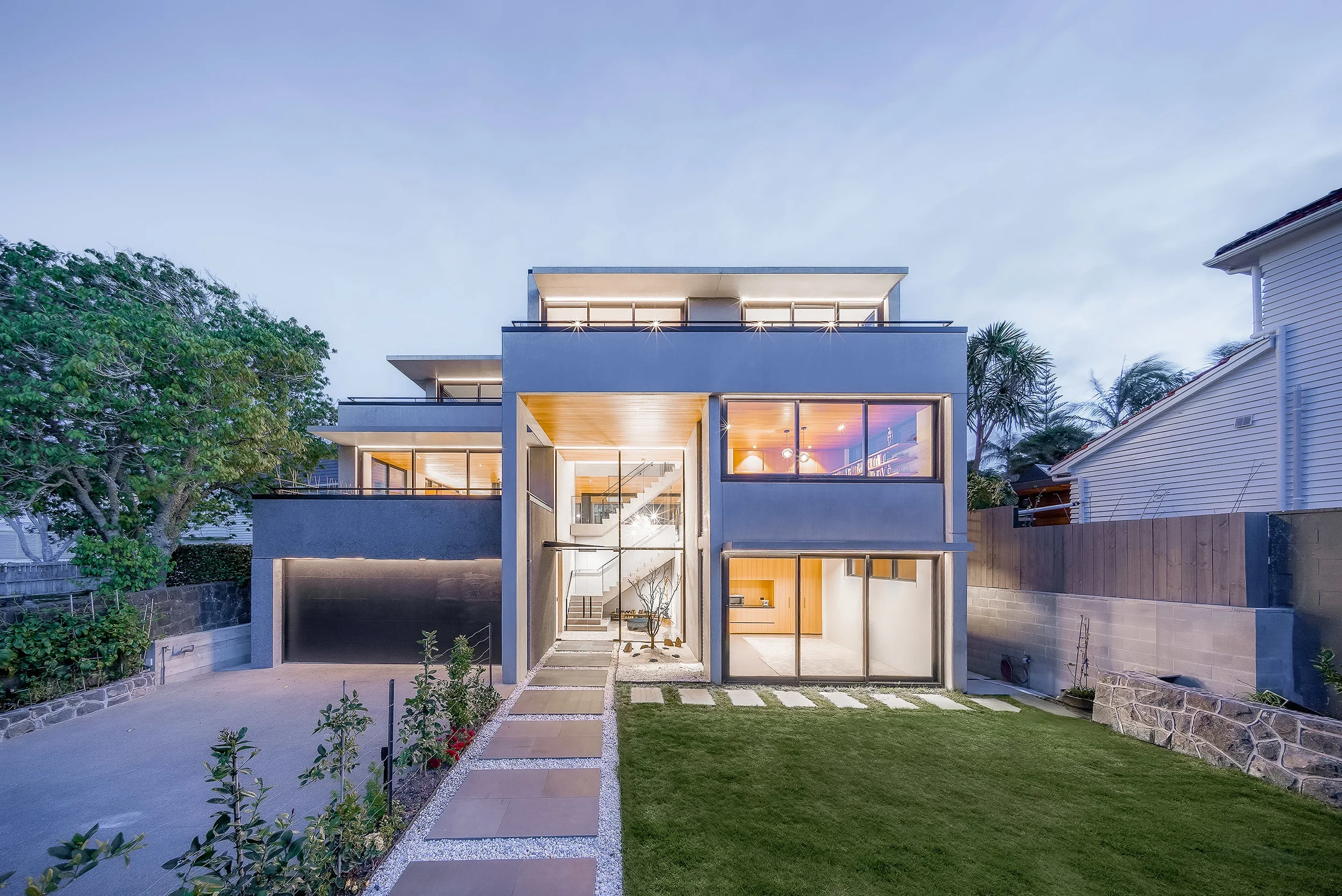 Set on an elevated site, the architecture is carefully arranged to capture both morning sunlight from the east and sweeping western views, while offering sheltered outdoor living areas throughout the day. West facing glazing is paired with adjustable louvres to filter sunlight, maintain privacy from neighbouring properties and frame views of the skyline and surrounding waterways. A large outdoor terrace with built-in fireplace overlooks a 25-metre lap pool, hot tub and lush front garden, seamlessly blending indoor and outdoor living.