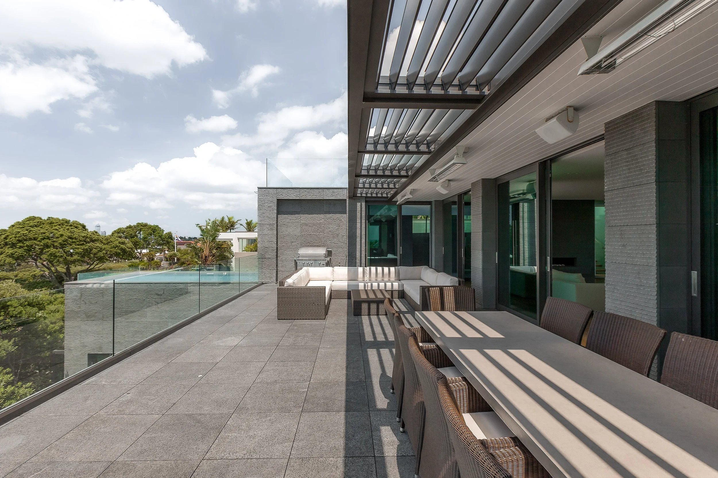 At its heart, a voluminous double-height living space is glazed on three sides, flooding the interior with sunlight as it moves throughout the day. Upper-level glazed louvres provide natural ventilation during warmer months, enhancing comfort while maintaining the home’s connection to the surrounding landscape. The exterior showcases a rich palette of natural stone materials, with basalt cladding featuring honed and flamed paving slabs alongside split-face and hammered columns and walls, providing strong texture and visual interest.