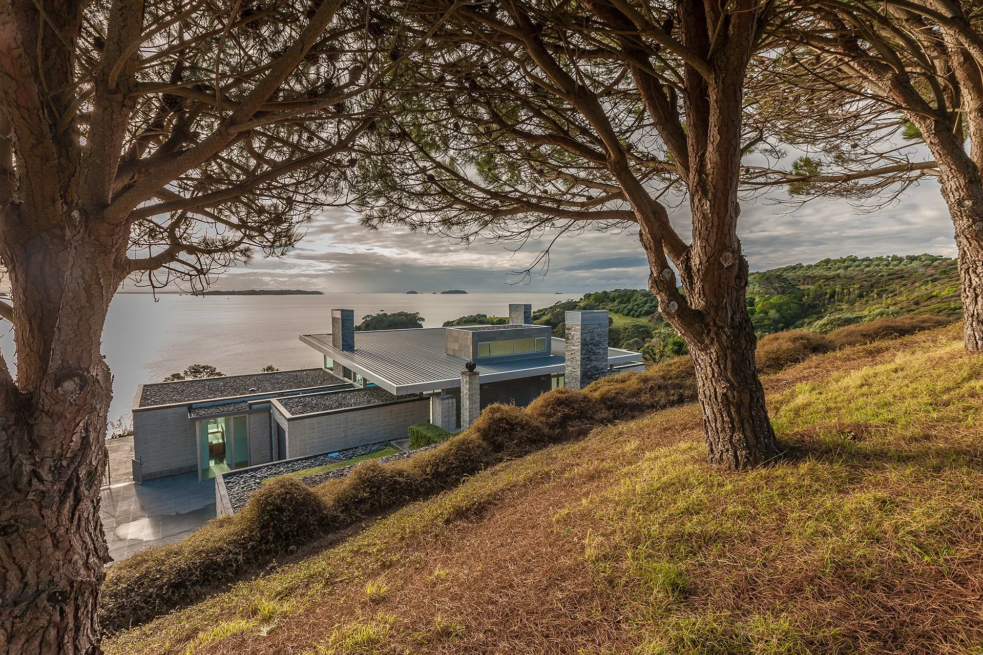 A GENEROUS SINGLE LEVEL BEACH ISLAND RETREAT NESTLED INTO THE COASTAL HILLSIDE WITH SWEEPING OCEAN VIEWS ACROSS THE HAURAKI GULF AND DOWN INTO THE BAY IMMEDIATELY BELOW.